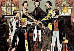 Chapter meetings, or attempted chapter meetings, occurred for months with the breach constantly widening. In February 1855, at an Oxford restaurant, a dramatic dinner meeting between the dissenting groups set the stage for Sigma Chi’s founding. Bell, Caldwell, Cooper, Jordan, Runkle, and Scobey hosted the event, hoping to mend ways with the other six. They were on hand early, awaiting developments with anticipation. Of the meeting, Founder Benjamin Piatt Runkle said, “With the kindest of intentions, we determined to give a dinner in their honor. I remember that the feast was prepared at the village restaurant, the guests invited, and on the appointed night, we gathered and waited for the guests. They did not come for a long time, and then only Mr. Reid and with a stranger. He took into his confidence Minor Millikin (an alumnus of the fraternity from nearby Hamilton, Ohio), and the two decided on strenuous proceedings.” Minor Millikin Steps Up